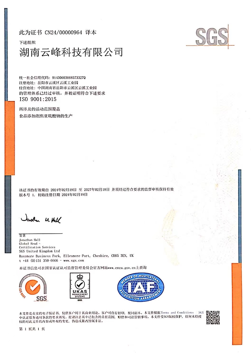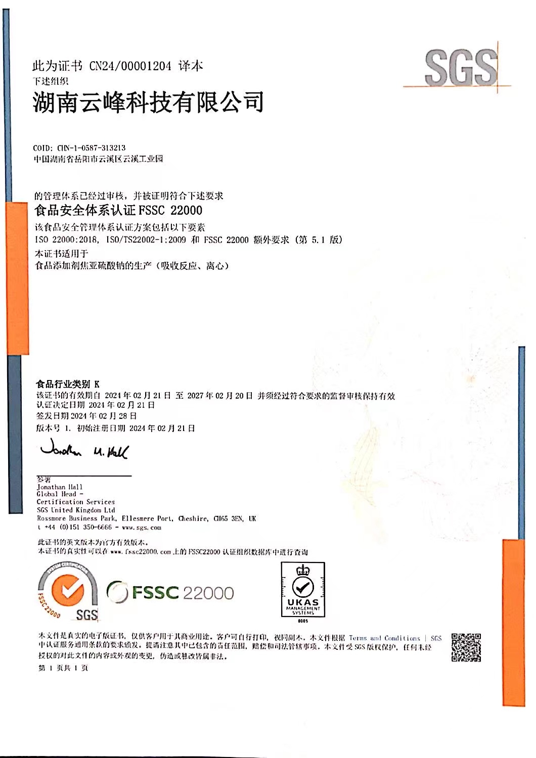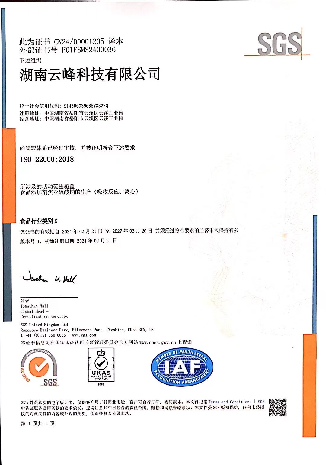 湖南云峰科技有限公司(以下簡稱云峰科技),是由長沙湘岳化工責任有限公司全額投資以生產焦亞硫酸鈉、亞硫酸鈉等亞硫酸鹽為主營業務的高科技企業,具有六十多年的生產歷史,同時也是焦亞硫酸鈉的國家標準制定參與者。在行業內具有很大的影響力。現有職工八十余人。具有優(yōu)良的經營管理團隊和成熟的生產技術隊伍。由多位在化學、化工行業擁有豐富工作經驗的工程師及技術員團隊組建而成,致力于亞硫酸鹽產品的研發(fā)、生產和銷售。2020年公司對生產設備、安環(huán)設施及工業技術等進行了大規(guī)模的升級改造,使焦亞硫酸鈉和亞硫酸鈉的生產工藝更加先進,技術更成熟,產品質量更優(yōu)良。無論在生產工藝、設備、產品質量、清潔生產、節(jié)能環(huán)保和員工素質方面,均處于行業領先地位。公司的主導產品“云峰”牌焦亞硫酸鈉,歷史悠久,深受國內外客戶信賴,產品遠銷東南亞、歐美、非洲、南美洲等20多個國家和地區,產品供不應求。